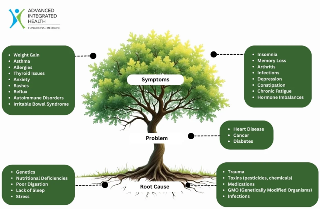 The standard practice in the current healthcare system is to meet with a healthcare professional (for an average of 8 minutes), discuss your symptoms briefly, then get a prescription for medication to treat those symptoms, usually without checking to see if there is an underlying condition that is causing those symptoms.